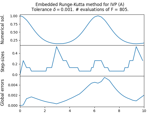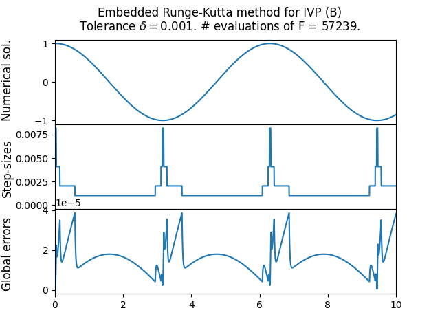 The next is the moderately stiff Curtiss–Hirschfelder equation \[\text{(B)}\quad\quad y'(t)=-50(y-\cos(t)),\quad t\in[0,10],\quad y(0)=1,\] with explicit solution \[y(t)=\frac{2500}{2501}\cos(t)+\frac{50}{2501}\sin(t)+\frac{1}{2501}e^{-50t}.\tag{13.14}\] We use a tolerance parameter of \(\delta=10^{-3}.\) Figure Figure 13.1 shows the results, including the sequence of step-sizes and global error. One can see how the step-size adapts according to the current state of the ODE. Also reported is the number of times the method evaluated the function \(F.\) One sees that for the stiffer ODE the step-sizes become very small, and the number of evaluations of \(F\) is correspondingly large. Indeed embedded RK methods are (essentially always) explicit methods, and as such not the optimal choice for stiff problems. On a positive note, the adaptive step-size means that the method doesn’t catastrophically fail like in Figure Figure 13.1, but instead does a reasonable job in the whole interval, at the cost of a small step-size. For the non-stiff ODE the step-size is kept quite large, and correspondingly the number of evaluations of \(F\) is quite low - nevertheless the magnitude of the global error roughly matches the tolerance parameter \(\delta.\)