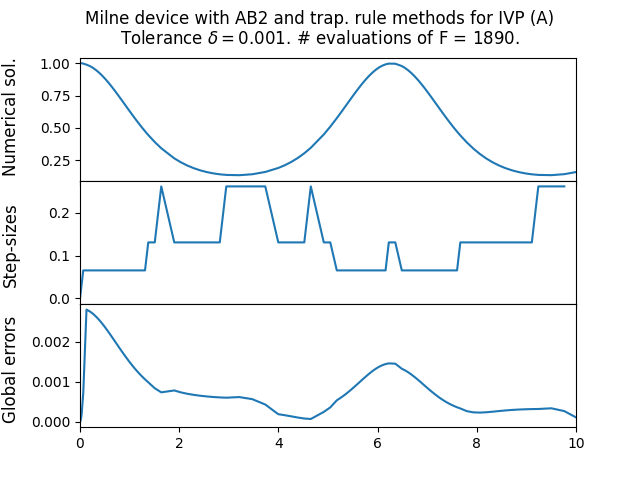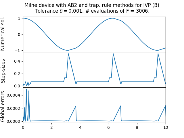 \(\text{ }\)Starting the method. As usual with multistep methods, one needs to apply an auxiliary methods in the beginning until one has the required number of “previous values” - one can for instance implement the whole method using an outer loop that checks if there are enough previous values in the mesh, and if not runs the auxiliary method - this can also provide the corresponding functionality required after doubling the step-size.