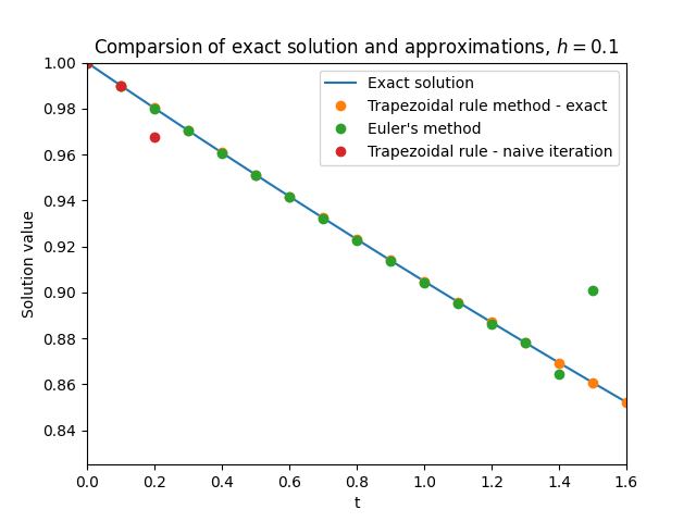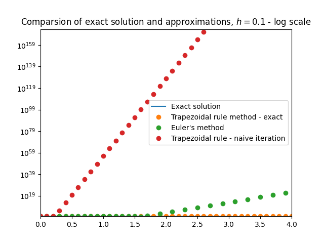 \(\text{ }\)Failure of trapezoidal rule with fixed-point iteration. The only method for solving these implicit equations we have seen so far is the naive fixed-point iteration of Section 9.4. The trapezoidal rule with say ten naive fixed-point iterations amounts to the method \[\begin{array}{ccl} w_{n,0} & = & y_{n},\\ w_{n,m+1} & = & y_{n}+\frac{h}{2}\left(F(t_{n},y)+F(t_{n}+h,w_{n,m})\right),0\le m\le9,\\ y_{n+1} & = & w_{n,10}. \end{array}\tag{12.29}\] Figure Figure 12.9 shows that this method performs even worse than Euler’s method on the stiff ODE ([eq:ch12_stiff_ode_first_example]) from Section 12.1. When we applied the trapezoidal rule method for this ODE in Section 12.1, with the good results shown originally in Figure Figure 12.1 and also included in the present Figure Figure 12.9, the exact solution of the implicit equation was used at each step (the ODE ([eq:ch12_stiff_ode_first_example]) is linear and for linear ODEs the exact solution can be written down explicitly).