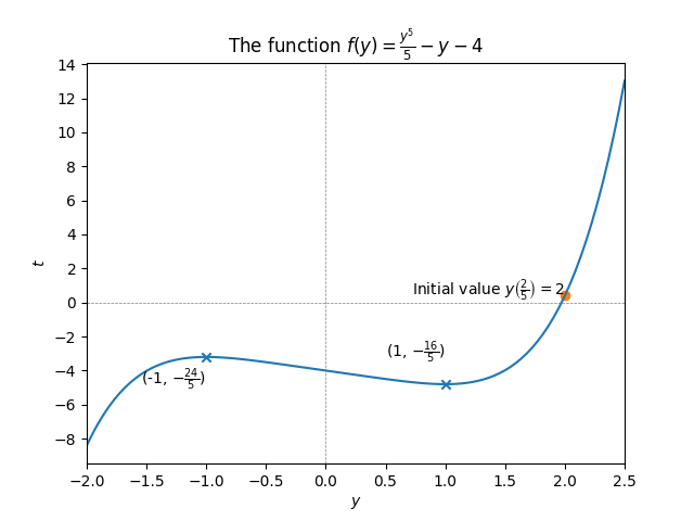 The solution curve has this general shape because for \(y\) large the term \(\frac{y^{5}}{5}\) “dominates” (it’s much larger than \(y\)), causing the steep divergence to \(\infty\) for \(y\to\infty\) and \(-\infty\) for \(y\to-\infty,\) while for small \(y\) the term \(-y\) “dominates” (it’s much larger than \(y^{5}\)) - the term \(-4\) is of course just a constant shift.