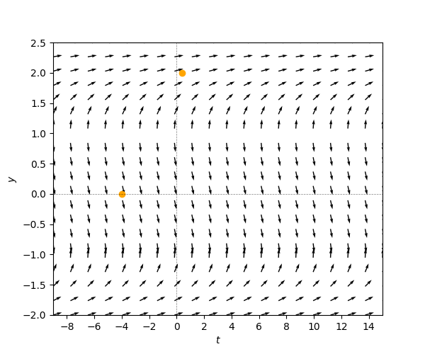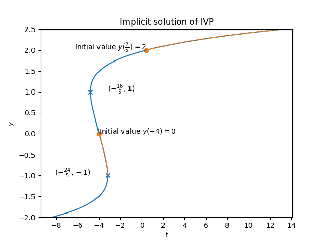 With the modified IVP condition \(y(-4)=0\) the implicit solution curve is the same (since the point \(y=0,t=-4\) lies on this curve, for the same \(c=4\)), but we see from the plot that the solution \(y(t),t\ge t_{0}=-4\) is decreasing and only exists up (and not including) \(t=-\frac{24}{5}\) which corresponds to the left critical point of Figure (Figure 3.13). With the flipped axes the critical points turns into a degenerate slope of “\(-\infty\)”, so as the solution to this IVP approaches \(t=-4\) the derivative \(y'(t)\) diverges to \(-\infty\) , so that the solution is no longer well-defined for \(t\ge-\frac{24}{5}.\)