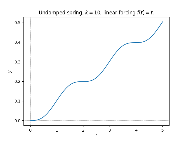\(\text{ }\) Linear external force. First consider \(f(t)=t,\) corresponding to a linearly growing force. To solve the IVP we need to find a particular solution. Because of the form of \(f(t)\) we make the ansatz \[y(t)=at+b.\] For this \(y(t)\) it holds that \[y''(t)+ky=bk+akt.\] This equals \(f(t)\) identically if \[bk=0\text{ and }ak=1\iff b=0,a=\frac{1}{k}.\] Thus a particular solution is given by \[y_{p}(t)=\frac{t}{k}.\] To solve the IVP ([eq:ch9_forced_spring_IVP]) we need to add a solution \(y_{h}(t)\) of the homogeneous equation \[y''+ky=0.\] We know from ([eq:ch5_aut_spring_mass_undamped_gen_sol]) that the general form of the solution is \[y_{h}(t)=\alpha\cos(t\sqrt{k})+\beta\sin(t\sqrt{k}).\] Thus the general solution to the non-homogeneous ODE ([eq:ch9_forced_undamped_spring_ODE]) is \[y(t)=\alpha\cos(t\sqrt{k})+\beta\sin(t\sqrt{k})+\frac{t}{k}.\] To find the the solution to the IVP ([eq:ch9_forced_spring_IVP]) we compute for this \(y(t)\) \[y'(t)=-\sqrt{k}\alpha\sin(\sqrt{k}\alpha)+\sqrt{k}\beta\cos(\sqrt{k}\beta)+\frac{1}{k}.\] Thus \(y(0)=\alpha\) and \(y'(0)=\sqrt{k}\beta+\frac{1}{k},\) so the IVP is solved if \[\alpha=0,\sqrt{k}\beta+\frac{1}{k}=0\iff\alpha=0,\beta=-\frac{1}{k^{3/2}}.\] Thus the solution is \[y(t)=-\frac{1}{k^{3/2}}\sin(t\sqrt{k})+\frac{t}{k},\] shown in the next figure.