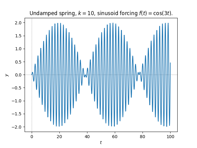Recall from Section 5.2 the model ([eq:ch5_aut_spring_mass_undamped_ODE]) of an undamped spring, i.e. \[y''+ky=0.\] \(\text{ }\) Including external force in model. Recall also the derivation ([eq:ch5_spring_deriving_first])-([eq:ch5_spring_deriving_last]), which took into account the force the spring exerts on the mass and friction (which we are ignoring here, since we are considering the undamped case). If there is also an external force \(f(t)\) acting on the mass, then the ODE model turns into \[y''+ky=f(t).\tag{8.6}\] Let us investigate the solutions to this ODE. We assume through the initial conditions \[y(0)=y'(0)=0,\] i.e. that the spring is initially at rest and neither extended nor compressed. Thus we are solving the IVP \[y''+ky=f(t),\quad\quad t\ge0,\quad\quad y(0)=y'(0)=0.\tag{8.7}\]