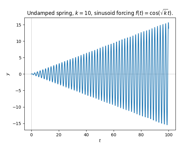 The spring oscillates at frequency \(\sqrt{k},\) as it does without forcing, but here the amplitude grows without bounds. This is because the frequency of the external force is just right so as to minimize the amount deceleration the force causes, and maximize the acceleration (i.e. the force further extends the spring when its momentum is already extending it, and compresses the spring when the momentum is already compressing it). This phenomenon is called resonance. Even complex physical systems generally have such a “resonant frequency”, whereby a small periodic external force with this frequency can cause a very large oscillation of the whole system. Resonance can cause bridges to collapse if the wind or traffic happens to cause oscillation at precisely the resonant frequency, as happened in 1940 in Tacoma, USA and was caught on film.