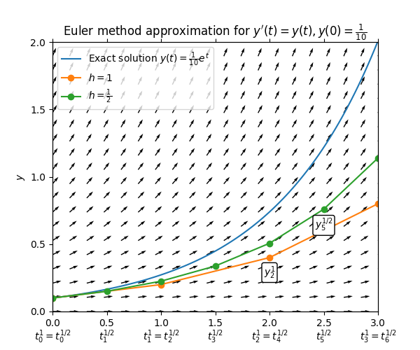 \(\text{ }\) Heuristic derivation Let \[\dot{y}=F(t,y),\quad\quad t\in I,\quad\quad y(t_{0})=y_{0},\tag{9.1}\] be an IVP. Any solution to the IVP must satisfy \[y(t)=y(t_{0})+\int_{t_{0}}^{t}F(s,y(s))ds,\] for all \(t\in I.\) Euler’s method is motivated by the approximation \[\int_{t_{0}}^{t}F(s,y(s))ds\approx(t-t_{0})F(t_{0},y(t_{0})).\] For continuous \(F\) and \(y\) this is a reasonable approximation if \(t-t_{0}\) is sufficiently small. So letting \(t_{1}=t_{0}+h\) for a small \(h,\) we define \[y_{1}=y_{0}+hF(t_{0},y_{0}),\] as the approximation of \(y(t_{1}).\) To get an approximation for larger values of \(t\) one iterates this, letting \(t_{2}=t_{1}+h=t_{0}+2h\) and approximating \(y(t_{2})\) by \[y_{2}=y_{1}+hF(t_{0},y_{0})=y_{0}+hF(t_{0},y_{0})+hF(t_{1},y_{1}).\] Continuing like this one ends up with a grid of “times” \(t_{n}\) with spacing \(h\) given by \[t_{n+1}=t_{n}+h,n=0,1,2,\ldots,\quad\text{so that }t_{n}=t_{0}+nh,\] and recursively defined approximations \[y_{n+1}=y_{n}+hF(t_{n},y_{n}),n=0,1,\ldots.\] For small \(h\) one can hope that the solution \(y(t)\) to the IVP satisfies \[y(t_{n})\approx y_{n}.\] When the step-size being used is not unambiguous from the context we indicate it as a super-script, writing e.g. \[y_{n+1}^{h}=y_{n}^{h}+hF(t_{n}^{h},y_{n}^{h}).\] The next plot shows the result of applying Euler’s method to the ODE \(y'=y\) for two different step-sizes.