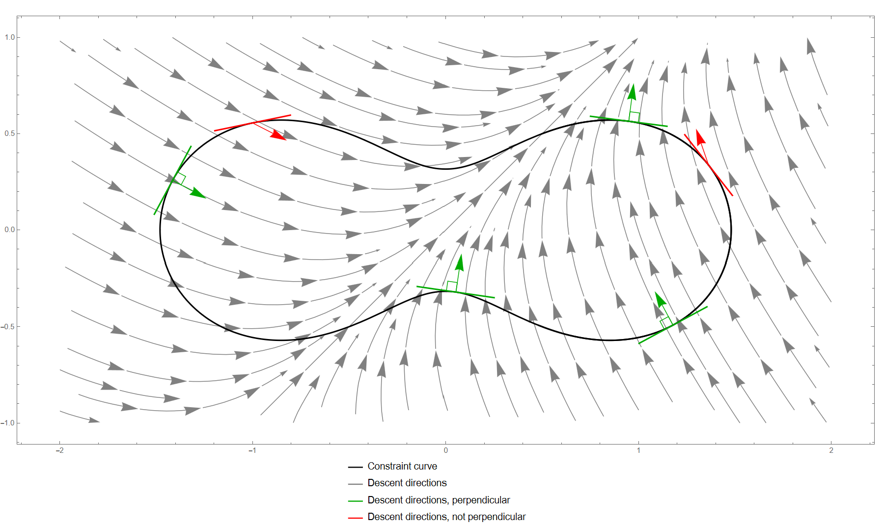 Let us superimpose Figure Figure 3.2, showing the curve defined by the constraint \(h(x)=0,\) onto Figure Figure 3.1, showing the (fastest descent) directions of the objective function \(f(x).\) The result is the following figure.