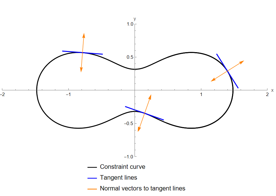 The gradient \(\nabla h(x)\) is a normal vector to the tangent plane at \(x,\) i.e. a vector that is perpendicular to the tangent plane. That is, the tangent plane consists of all \(y\in\mathbb{R}^{d}\) such that \((y-x)\cdot\nabla h(x)=0.\) Figure Figure 3.1 illustrates this for \(d=2\) and constraint function \(h:\mathbb{R}^{2}\to\mathbb{R}\) given by \[h(x_{1},x_{2})=\frac{1}{(x_{1}+1)^{2}+x_{2}^{2}+1}+\frac{1}{(x_{1}-1)^{2}+x_{2}^{2}+1}-\frac{9}{10}.\] Since \(d=2,\) the constraint \(h(x_{1},x_{2})=0\) defines a curve in the plane, and the tangent planes are lines.