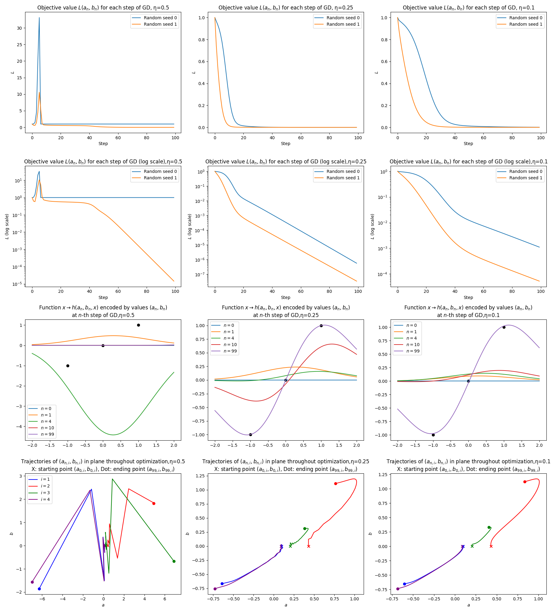 Note that if \(a=b=0,\) then \(D_{a,i}(a,b)=0\) regardless of the values of \((x_{k},y_{k}),\) and for these particular \(x_{k},y_{k}\) also \(D_{b,i}(a,b)=0\) by symmetry. Thus if we set \[a_{0}=b_{0}=(0,0,0,0),\] then the iterates of gradient descent will stay fixed at these values forever: \[a_{n}=b_{n}=0\quad\forall n\ge0.\] This clearly not desirable. To avoid this one could set say \[a_{0}=b_{0}=(1,1,1,1).\tag{3.5}\] Then \(D_{a,i}(a_{0},b_{0})\ne0\) and \(D_{b,i}(a_{0},b_{0})\ne0\) for all \(i=1,2,3,4,\) so gradient descent is not stuck at the starting point. But note that if \(a_{0,1}=\ldots=a_{0,4}\) and \(b_{0,1}=\ldots=b_{0,4},\) then \(D_{a,i}(a_{0},b_{0})\) and \(D_{b,i}(a_{0},b_{0})\) take the same value for each \(i.\) Thus each entry of \(a_{n}\) and \(b_{n}\) are identical for every \(n,\) so gradient descent effectively stays stuck inside the subspace where \(a_{1}=\ldots=a_{4},\) \(b_{1}=\ldots=b_{4}.\) The latter is the subspace of functions \(x\to h(a,b,x)\) that effectively have only one “bump” function. A single bump function can not fit the data set (3.4), so the initial condition (3.5) is not suitable.
