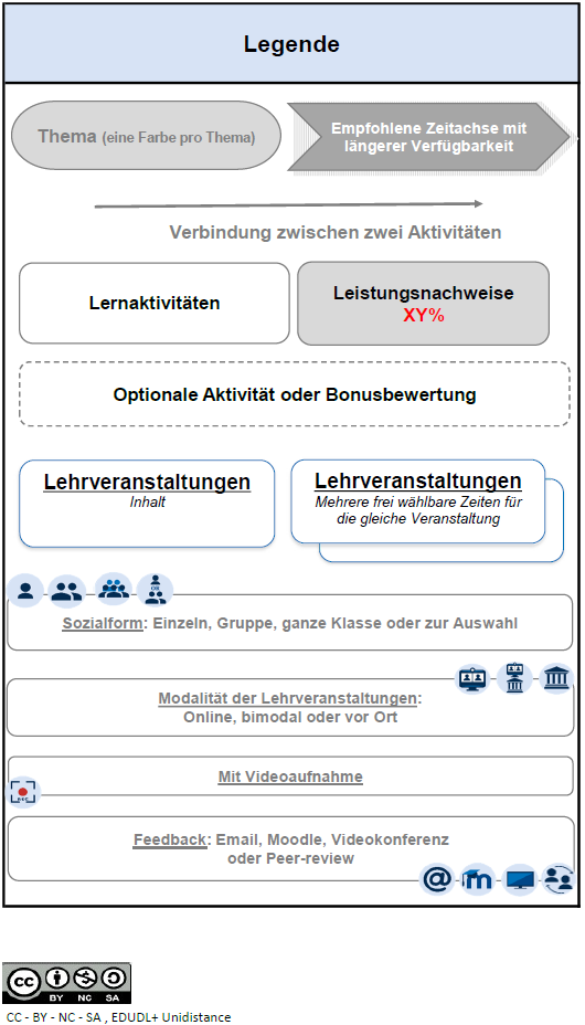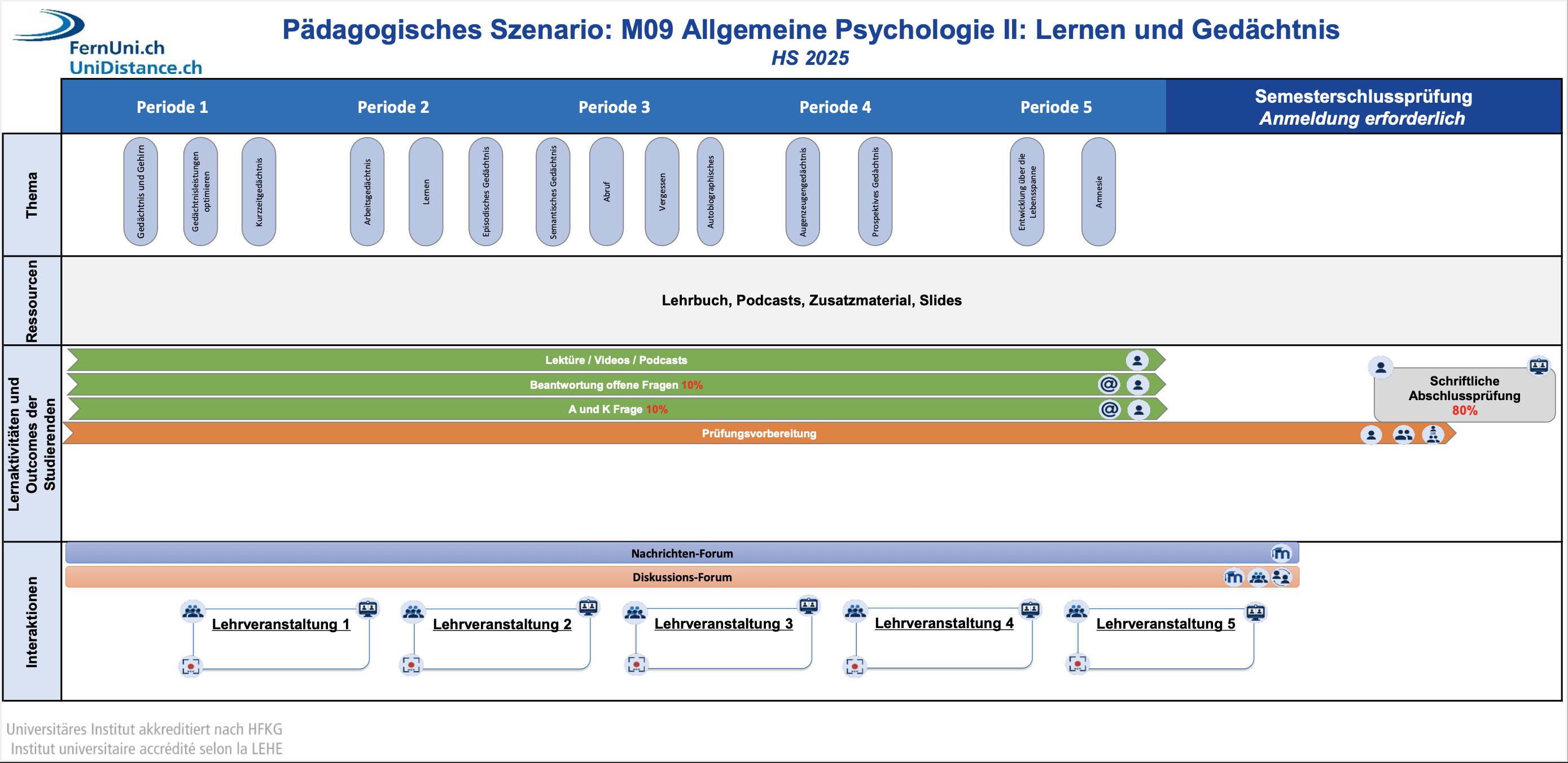Das folgende pädagogische Szenario zum Modul ist deckungsgleich mit den Inhalten des «Pädagogischen Szenarios», welches an der FernUni Schweiz für jedes Modul auf Moodle hinterlegt wird. Die darin enthaltenen Informationen geben einen Überblick hinsichtlich der zeitlichen Organisation der verschiedenen Aktivitäten und Leistungsnachweise in diesem Modul. Bitte lesen Sie diese Informationen gleich zu Beginn des Semesters aufmerksam durch, damit Sie über die Inhalte und Anforderungen im Rahmen dieses Moduls informiert sind und entsprechend planen können.